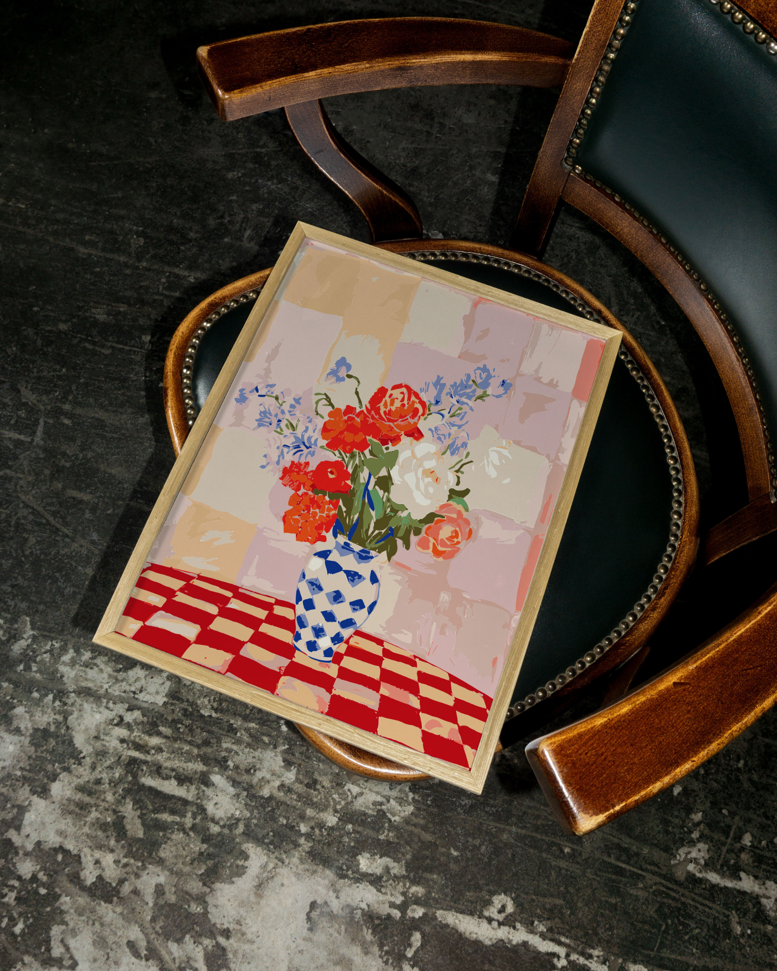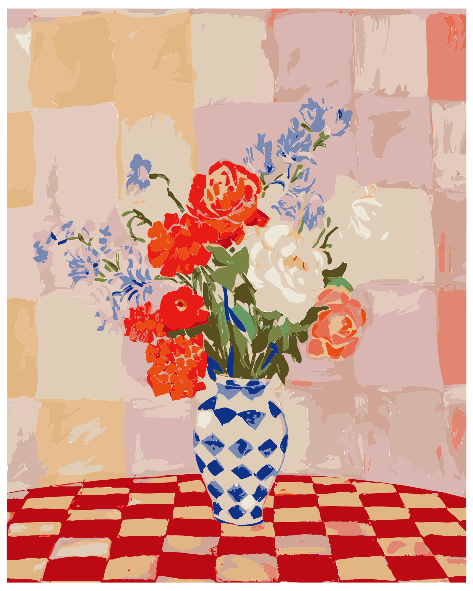 Deze vaas met bloemen staat op een tafeltje met blocks, deze zie je ook terug in de achtergrond. Op deze manier zijn er extra kleuren toegevoegd, perfect voor painty by numbers. Dit speelse vaasje met bloemen is een kleurrijk cadeau voor jezelf of een ander én de bloemen blijven altijd mooi.